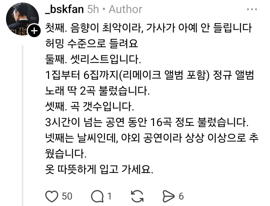 박효신이 7년 만에 단독 콘서트를 열었는데 반응이 별로라는군.음향 시스템이 최악이었고, 괴상한 AI 영상까지 나왔으며, 추워서인지 음정 실수가 계속 나왔다고.결국 노래를 제대로 소화하지 못했다고 평가받고 있네.
