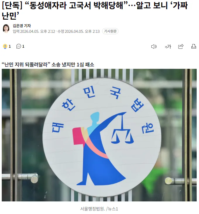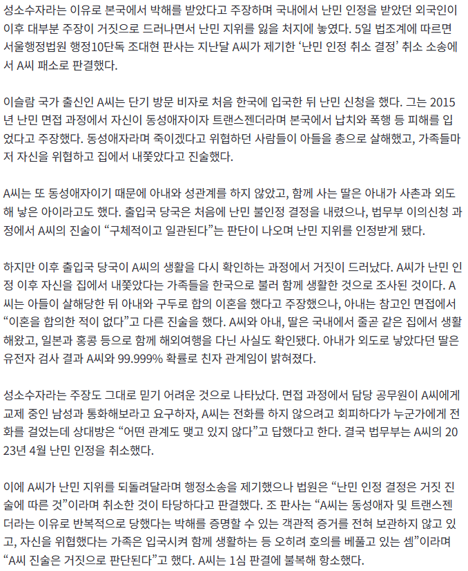 성소수자 박해를 피해 난민을 신청했다고 주장한 사람이 알려지고 보니 완전 거짓이었다고 한다. 고국에서 동성애자라는 이유로 차별과 박해를 받았다며 국제 보호를 청구했던 건데, 조사 결과 그 주장이 전부 거짓으로 드러났다고 한다.