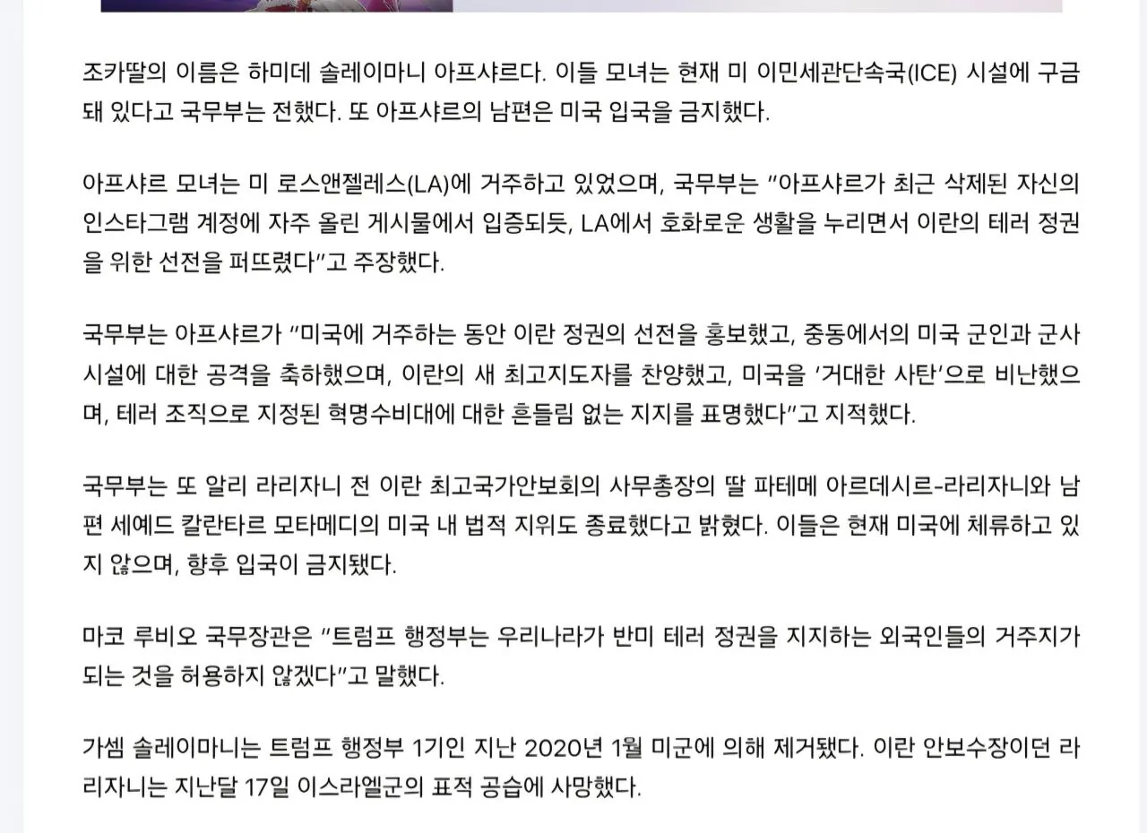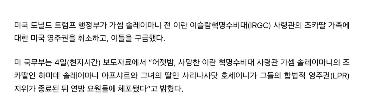 “LA 호화 생활·이란 선전”…前혁명수비대 사령관 조카딸, 美 영주권 취소·구금