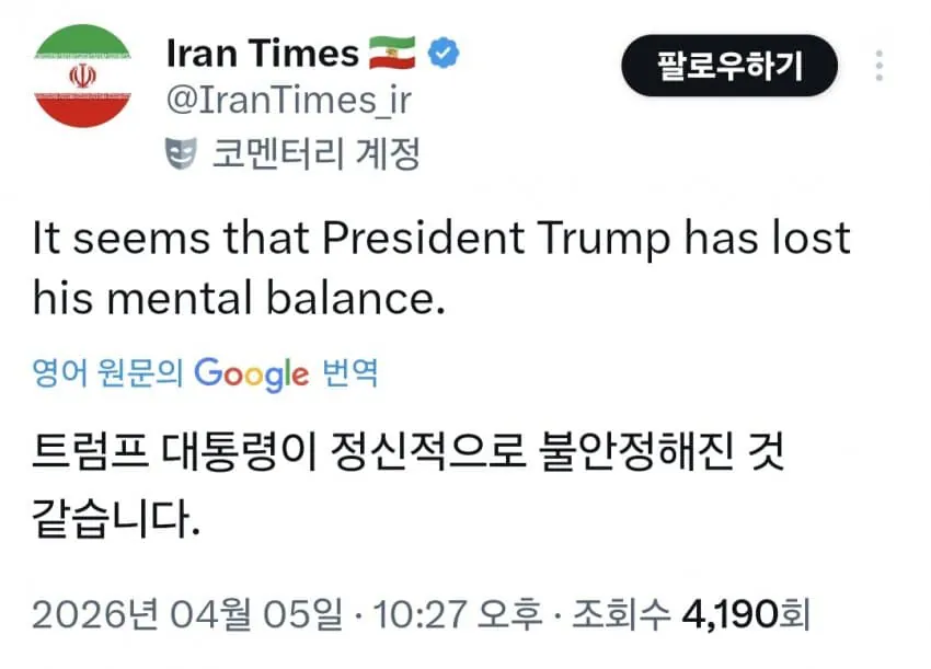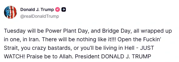화요일이 뭔가 특별한 날이 될 거라고 하는데, 발전소나 교량 같은 시설들이 없어질 수도 있다는 뜻인 것 같다.호르무즈 해협을 개방하라는 요구가 반복되고 있고, 그렇지 않으면 큰 일이 날 거라는 협박 톤의 메시지들이 있다.종교를 조롱하는 표현도 섞여 있다.어쨌든 이 글을 작성한 사람의 정신상태가 뭔가 불안정해 보인다는 게 핵심인 것 같다.