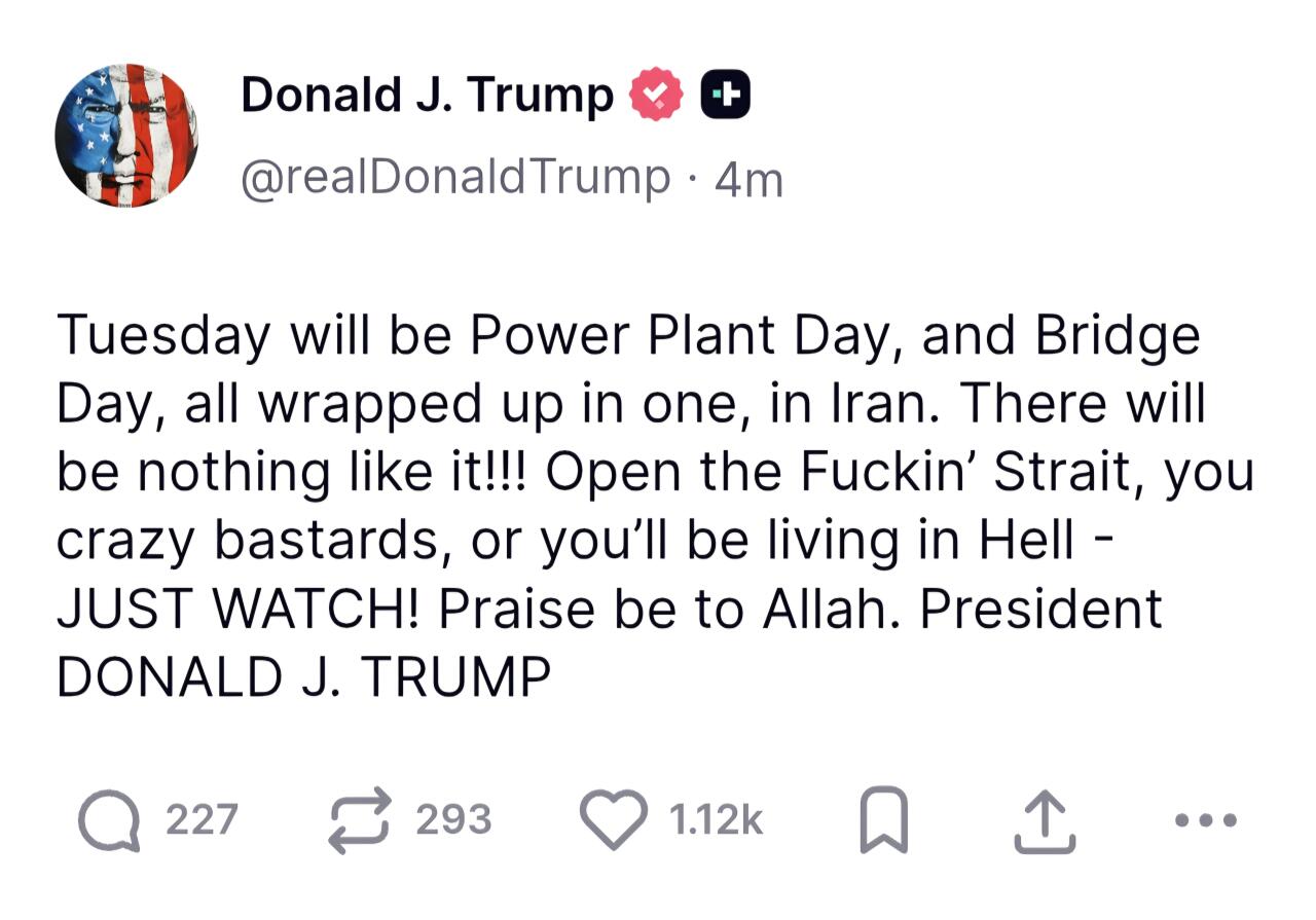 특정 날짜를 명시하며 이란에 대한 엄중한 경고를 발표했다. 발전소와 교량 같은 핵심 인프라를 언급하며, 전에 없던 규모의 조치가 있을 것이라고 시사했다. 호르무즈 해협 즉시 개방을 강력히 촉구했으며, 불응할 경우 돌이킬 수 없는 대가를 치르게 될 거라고 못을 박았다. 종교적 신앙심으로 자신의 결의를 표현했으며, 트럼프 전 대통령의 직접 성명이다.