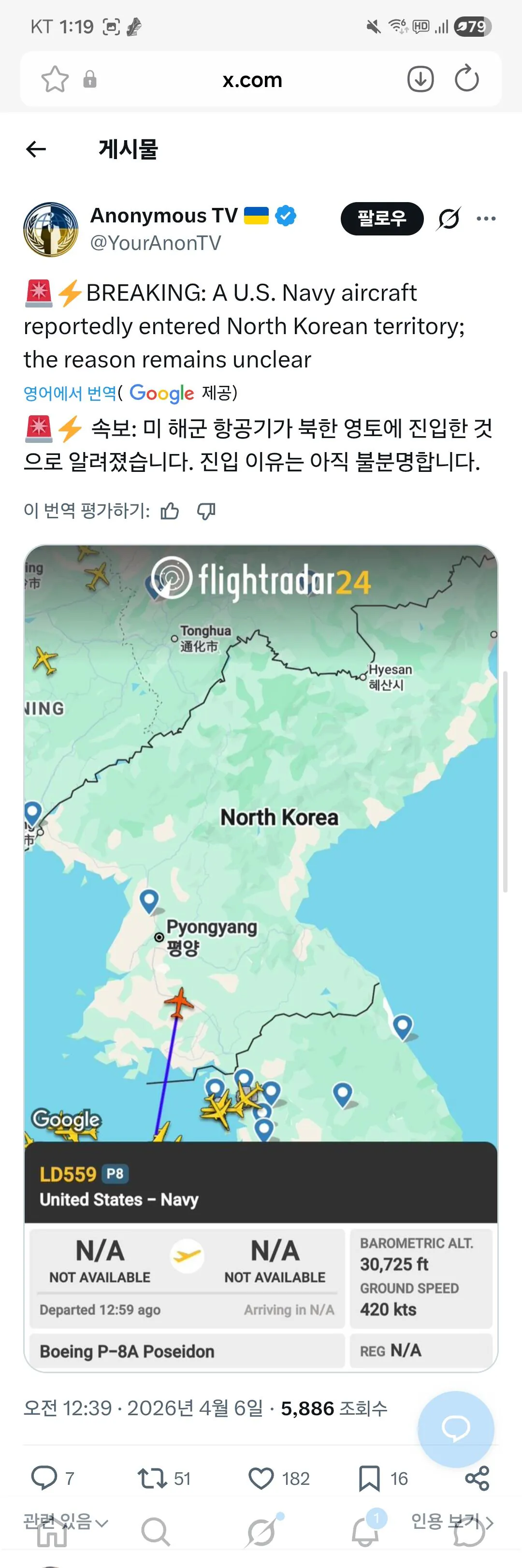 미 해군 항공기 북한 상공 진입했다는데 이유 불명