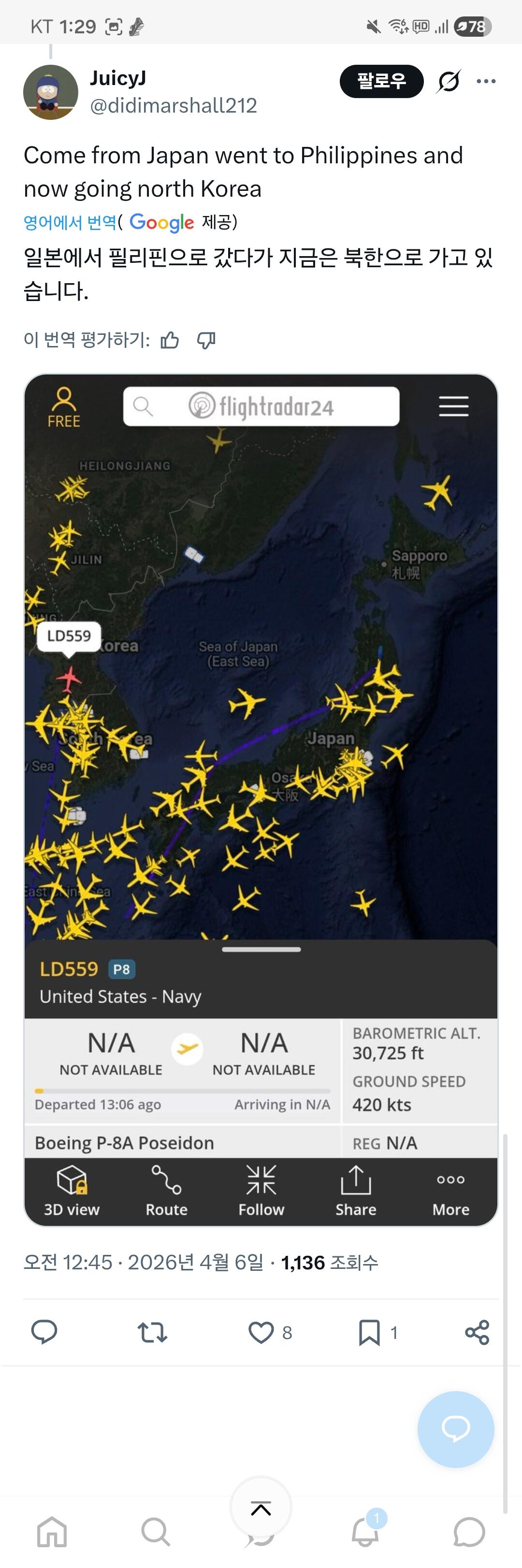 항공기는 일본에서 이륙해 필리핀을 거쳐 북한 방향으로 이동 중인 것으로 알려짐