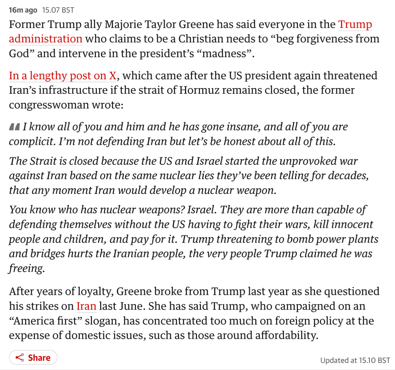 호르무즈 해협 문제로 이란 시설 공격을 계속 경고하는 미국 대통령. 이 상황에 대해 트럼프 행정부에 있던 마조리 테일러 그린이 직접 목소리를 높였다.