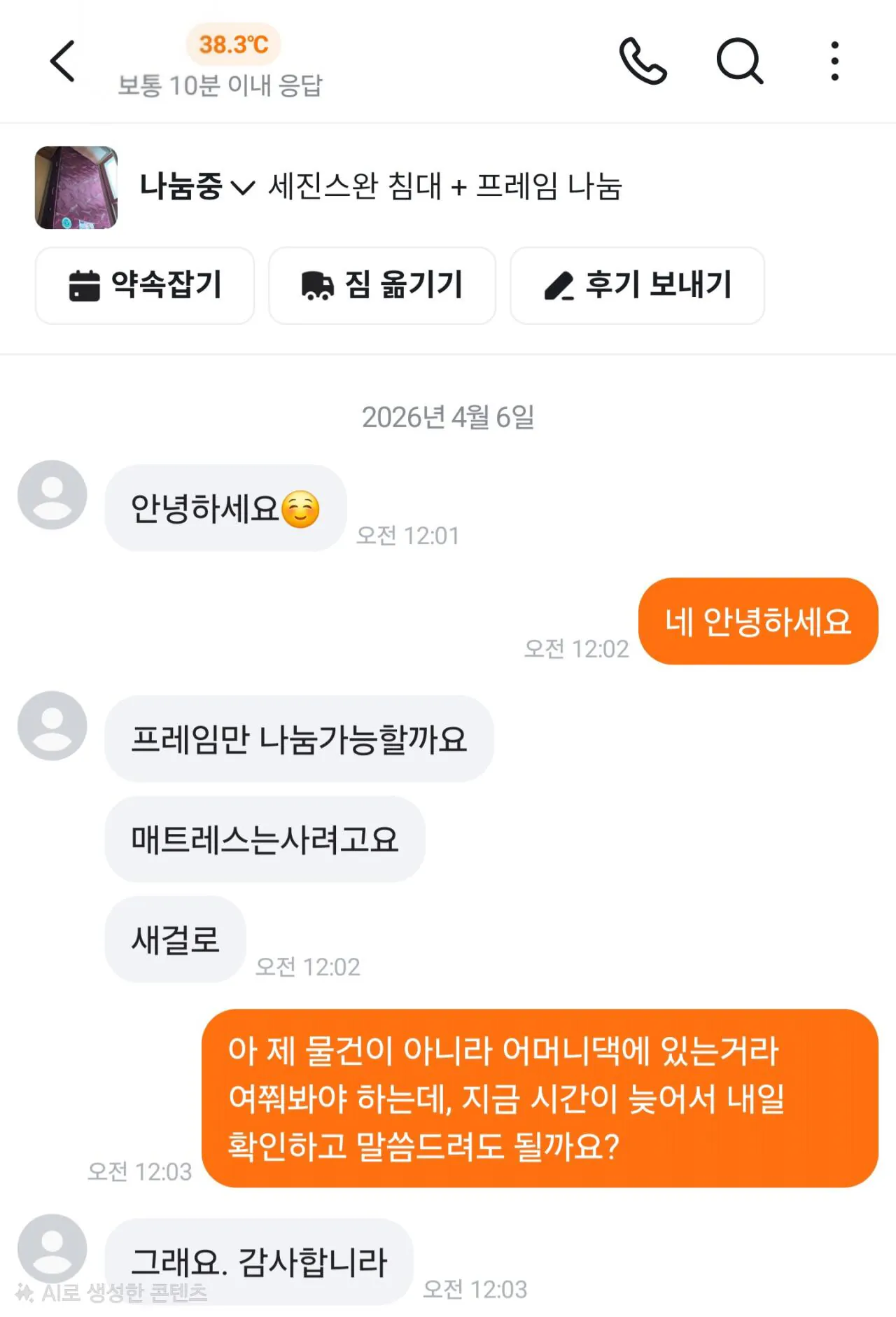 어머니 이사를 앞두고 예전에 쓰던 침대를 당근에 올렸어. 매트리스랑 프레임을 함께 가져가도 되고, 프레임만 원하면 그것도 괜찮다고 명확히 했는데