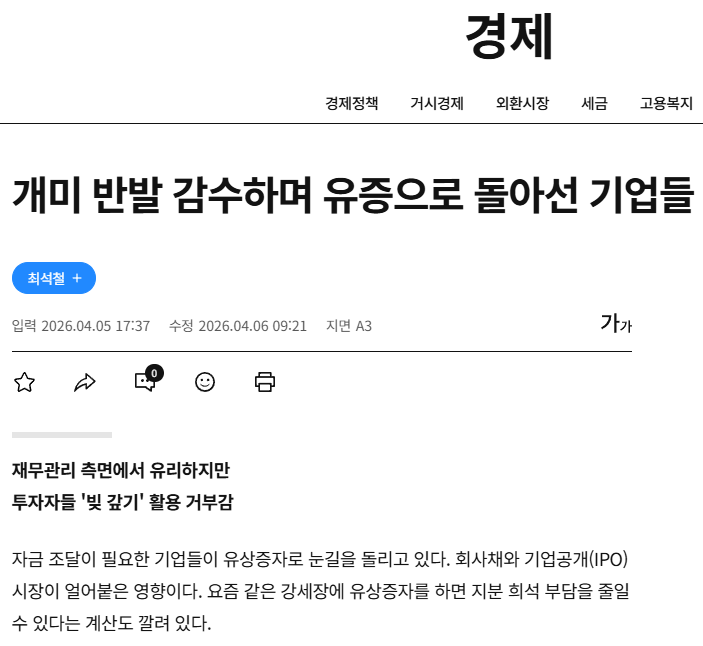 높은 금리 환경에서 코스피 상장사들이 유상증자를 통한 자금조달에 적극 나서고 있다.중복상장 규제가 강화되면서 새로운 상장 경로가 막힌 상황에서 기존 기업들은 더더욱 유상증자로 눈을 돌릴 수밖에 없다는 분석이다.일반 투자자들의 반발은 있지만 기업 입장에선 현실적 선택지가 많지 않은 만큼 향후 유상증자 규모는 더 커질 것으로 예상된다.