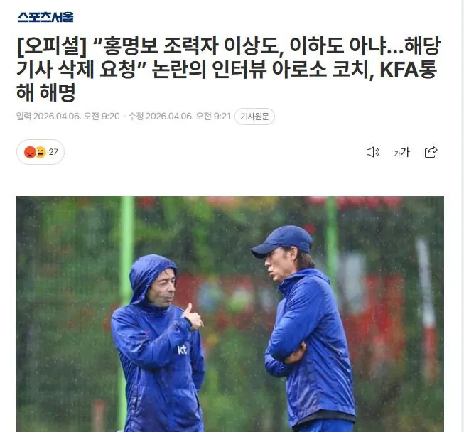 포르투갈 언론과의 인터뷰 내용이 자신의 말과 다르게 실렸다며 아로소 수석코치가 강하게 반발했다. KFA 공식 입장을 통해 해당 기사의 삭제를 요청하고 법적 조치까지 예고한 상황. 코치는 '현장의 감독, 얼굴' 등으로 표현된 부분들이 본인이 한 발언이 아니라고 주장했다. 또한 전술 방향 결정은 자신 혼자가 아니라 코칭 스태프 전체 회의를 통해 결정되는 것이라고 설명했다. 다만 팬들 사이에선 '기사 왜곡'이라는 명분만으로는 부족하다는 의견이 많은데, 핵심 내용들이 조작됐다는 주장까지 나오고 있어서다.
