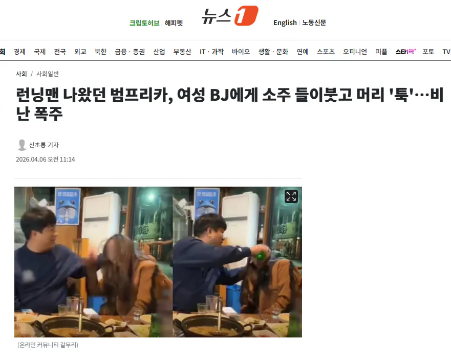 인터넷 방송의 1세대 진행자 범프리카가 생중계 도중 음식점에서 일으킨 사건이 논란이 되고 있다. 그가 흡연한 것은 물론 같은 자리에 있던 여성 BJ에게 신체적 해를 끼친 정황이 포착된 것이다. 예능 프로그램 런닝맨에서 활동한 적이 있는 그의 이 같은 행동이 알려지면서 네티즌들의 질타가 이어지고 있다.이제 뉴스까지 나온 상황이다.
