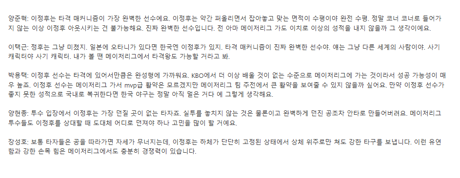 대중적인 의견과는 다르게 꽤 균형잡힌 평가를 해주셨더라. 어차피 올해 우익수들 중 연봉 4위 정도인데 충분히 잘 평가받는 거 아닌가?
