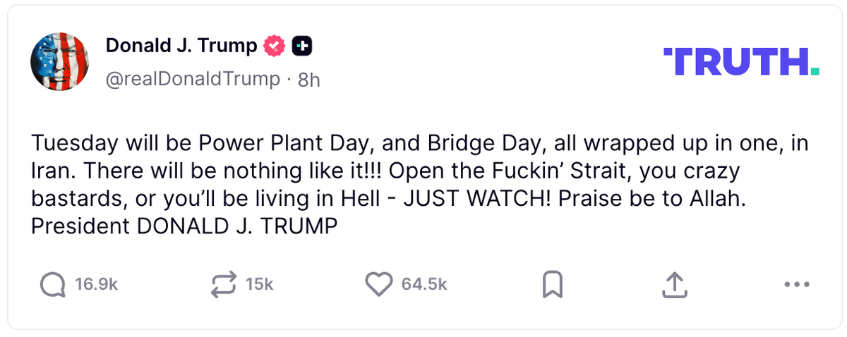 화요일 이란이 발전소와 교량 관련 상황을 동시에 터트릴 것 같다고 했다. 그 해협은 반드시 열어야 한다며 강경하게 나섰고, 안 그러면 지옥 같은 일이 벌어질 거라고 협박했다. 알라 언급까지 섞으면서 강한 톤을 유지했다.