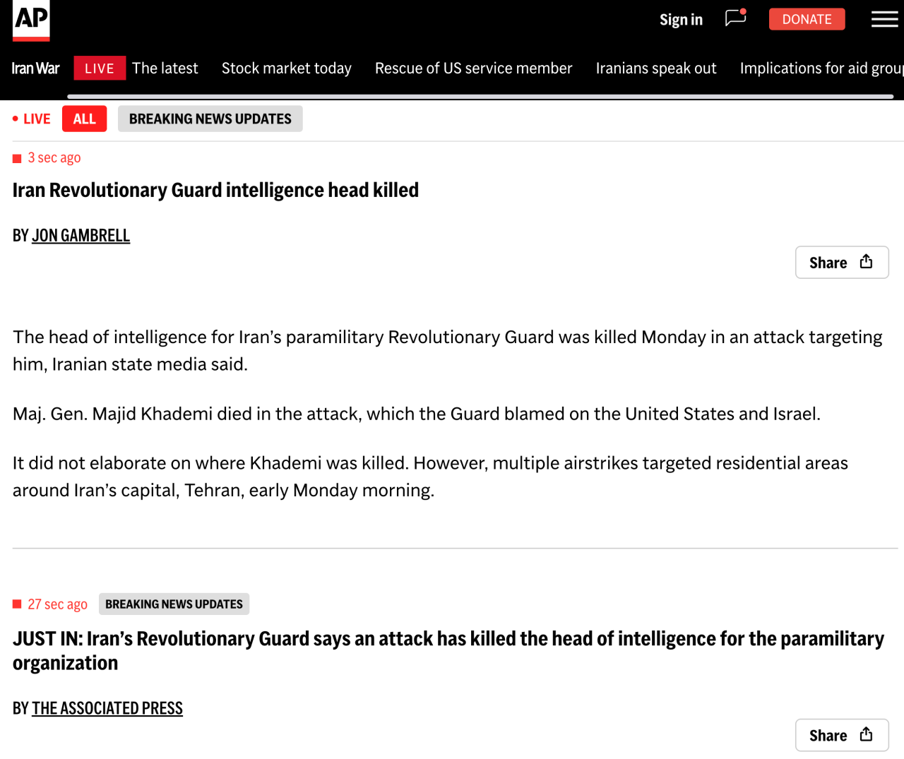 이란 국영 매체에 따르면 월요일 새벽 테헤란 인근에서 발생한 공습으로 혁명수비대(IRGC)의 정보국장 마지드 카데미 소장이 사망했다. 혁명수비대는 미국과 이스라엘이 이번 공격의 배후라고 지목했으며, 사망 장소의 구체적 위치는 공개하지 않았다. 다만 당시 테헤란 거주 지역을 대상으로 여러 차례의 폭격이 이뤄진 것으로 알려졌다.