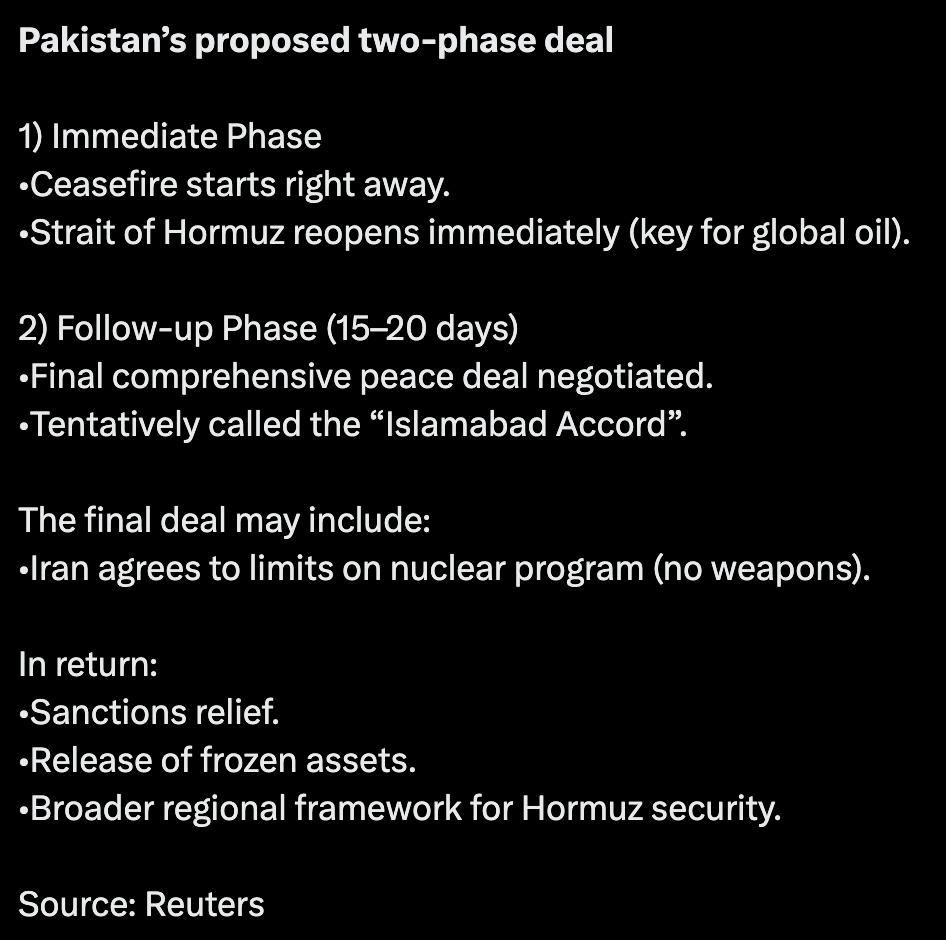 로이터 보도로 본 파키스탄 제안의 2단계 협상안:【1단계】 지금 당장• 즉각 정전 시작• 호르무즈 해협 다시 열기 (세계 석유 수급의 중심)【2단계】 약 2~3주• 본격 평화협상 추진 (이슬라마바드 협정)• 최종 합의:- 이란: 핵무기 개발 포기- 대신: 제재 풀어주기, 동결자산 풀어주기, 호르무즈 해협 안보체계 재구축