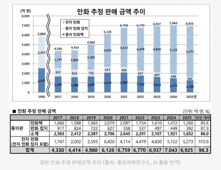 일본 만화 시장의 흐름이 크게 바뀌고 있어. 올해 통계를 보면 전년 대비 약 1.7% 정도 감소했는데, 특히 출판 부문이 심각하네. 잡지랑 단행본 판매량이 작년보다 14%나 줄었대.
