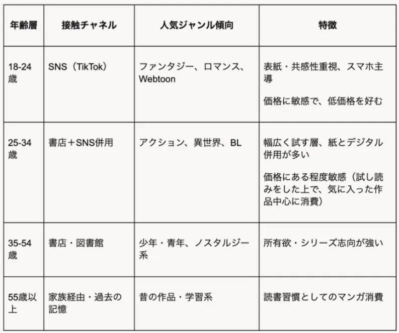 일본 무역진흥공사에서 조사한 북미 시장 보고서 중 미국인들이 연령별로 가장 선호하는 만화 장르 조사인데