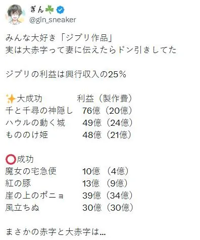 참고: 극장 상영만 기준. 굿즈 판매 포함하면 나우시카·라퓨타·토토로는 흑자 전환