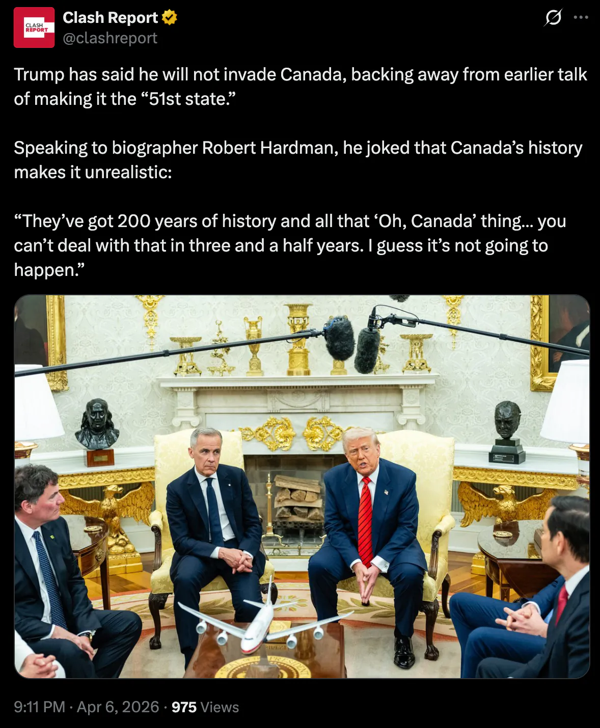 미국의 도널드 트럼프 대통령이 캐나다를 미국의 51번째 주로 만들겠다는 과거 발언을 철회했다. 캐나다 침략 의사가 없다는 것을 명백히 한 것이다. 전기 작가 로버트 하드먼과의 인터뷰에서 트럼프 대통령은 캐나다의 유구한 역사를 언급하며 편입설은 현실적이지 않다고 농담처럼 말했다. 그는 "캐나다는 200년의 역사를 가지고 있고 '오 캐나다'라는 국가 상징이 있다"고 설명한 뒤 "3년 반이라는 짧은 남은 임기에 그런 문제를 처리하기란 어렵다. (편입은) 일어나지 않을 일이다"라고 덧붙였다.