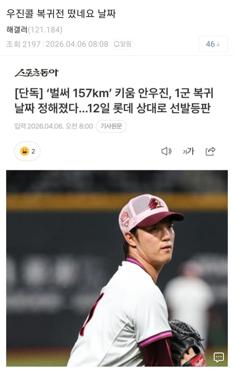 에이스 투수 부상 복귀, 2군서 조용히 시험 등판
