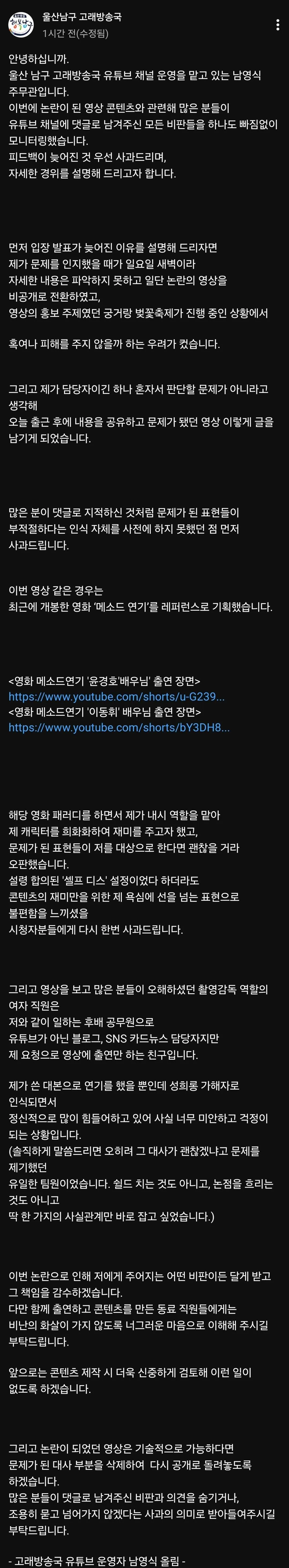 논란 일으킨 울산 남구 유튜브 채널, 이제야 사과하네