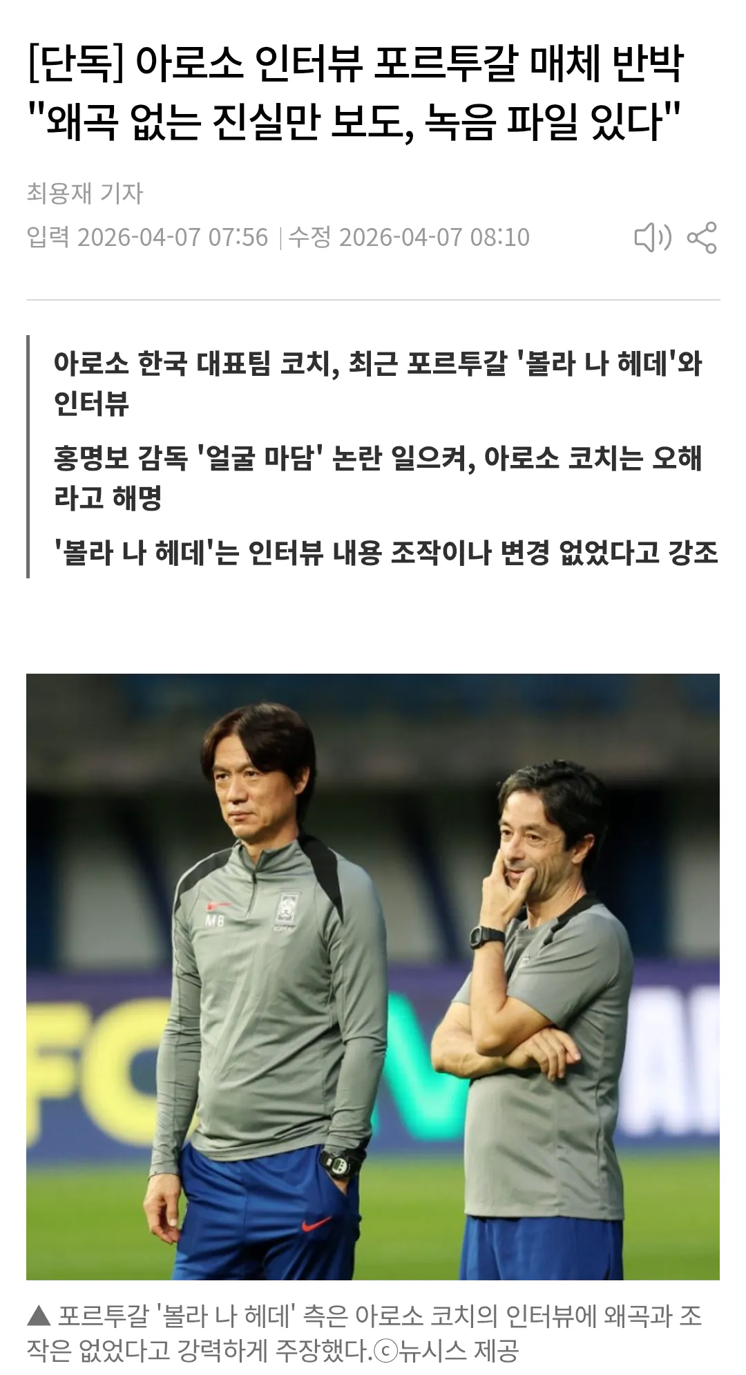 곧바로 아로소 코치가 나섰다. 협회 공식 입장을 통해 기사가 왜곡됐다고 주장. 자신은 그럴 표현을 한 적 없으며, 홍 감독의 보조역할만 한다고 강조했다.