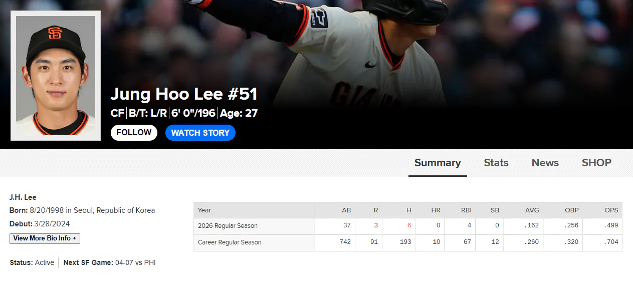 첫 타석은 뜬공두 번째 타석은 병살타세 번째 타석은 땅볼마지막에 중전안타4타수 1안타, 타율 0.162, OPS 499