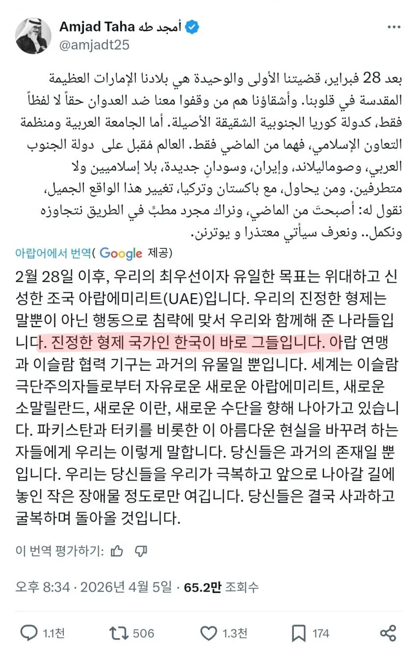 아랍연맹이고 이슬람협력기구고 다 말만 늘어놓다가 이제는 옛날 유물이 되어버렸지반면에 실질적으로 움직여서 도움을 주는 한국이야 진정한 형제국이라고 할 수 있다는 거네
