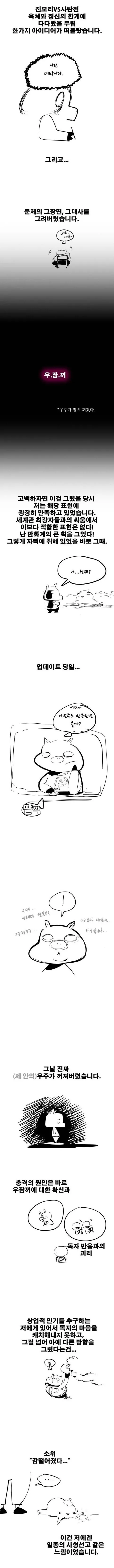 초반의 경직된 태도에서 벗어나 점점 더 유연해지더니결국 자신의 작품을 진심으로 즐기는 단계에까지 도달했다는 이야기데뷔작인 '쎈놈'도 정말 재미있게 그렸다고 하니까 진짜 실력이 있는 작가네