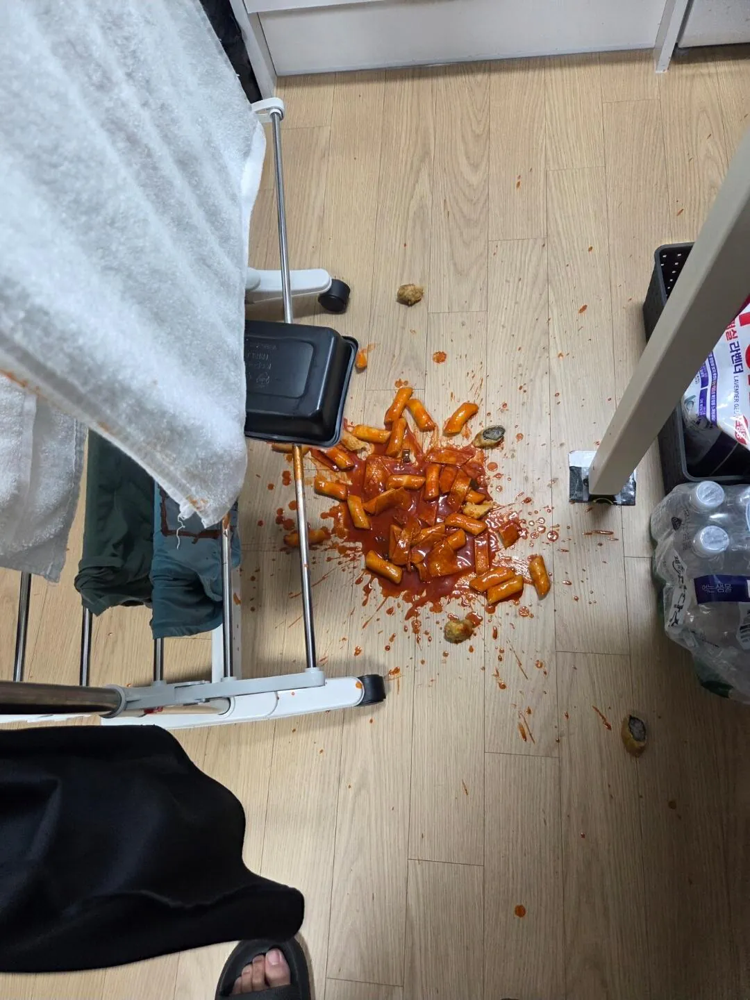 바닥만 흘렸으면 다행인데 옷에도 다 튀고 수건도 젖어버렸네