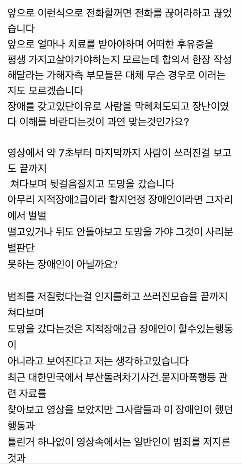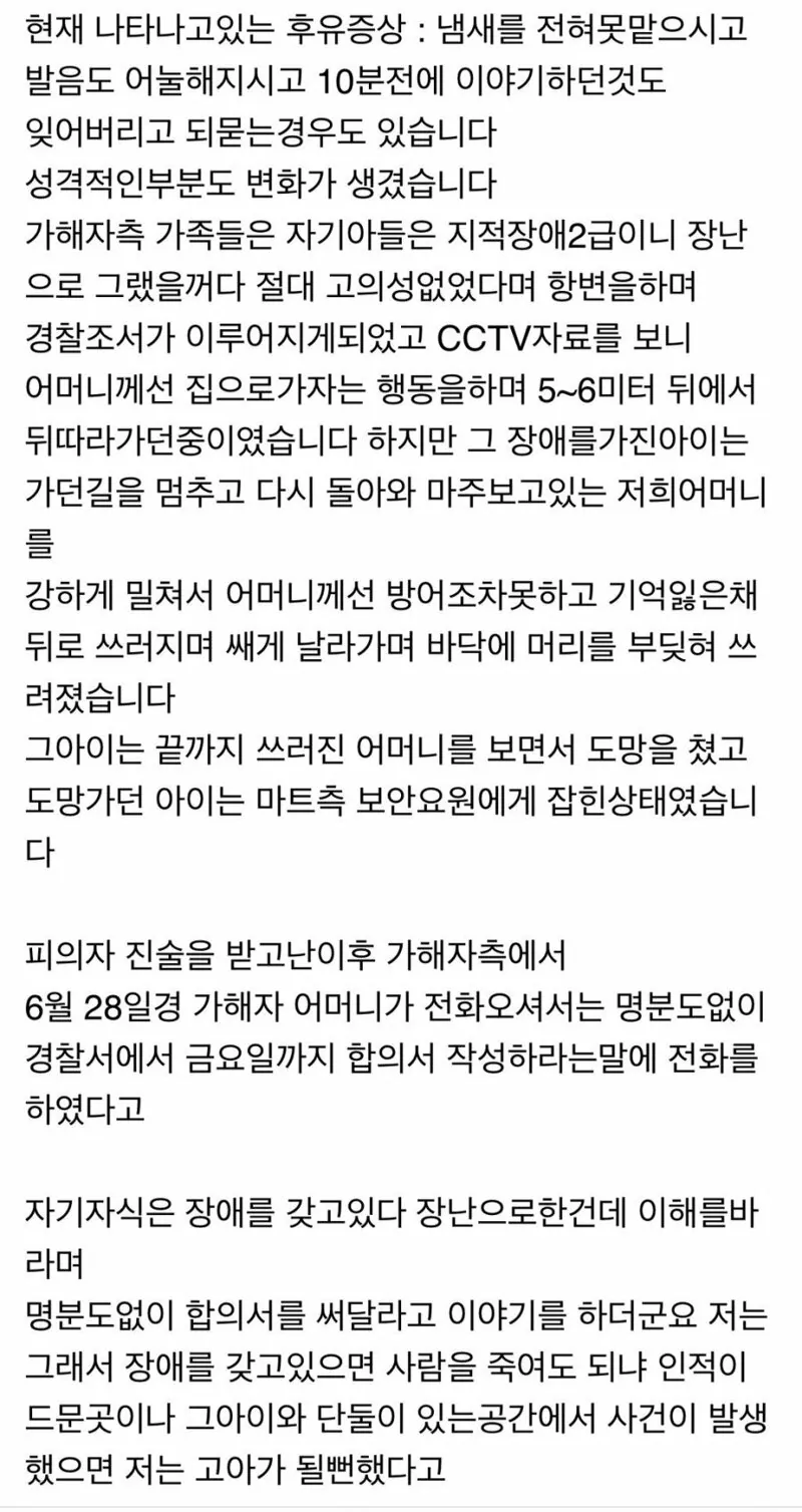 어머니가 장애인에게 밀려서 뇌손상 입었다더라