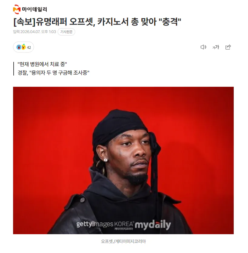 [속보]유명래퍼 오프셋, 카지노서 총 맞아 "충격"