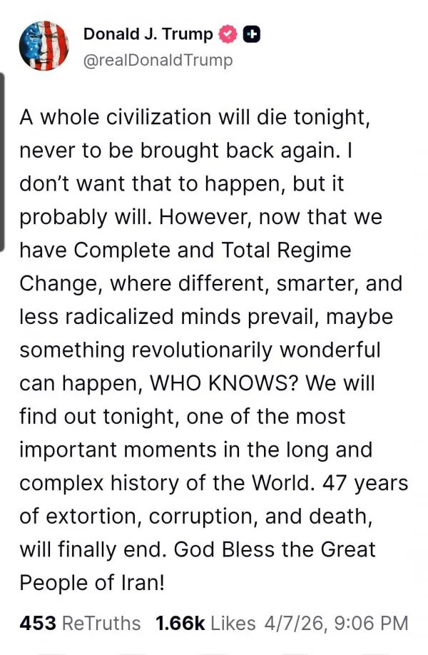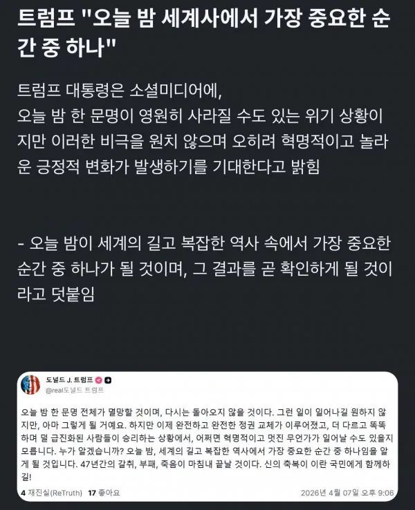 오늘밤은 인류 역사에서 매우 중요한 시점이 될 가능성이 있다고 언급했습니다. 한 문명이 완전히 사라질 수도 있지만, 그런 일이 실제로 일어나기를 원하지는 않는다고 덧붙였습니다.