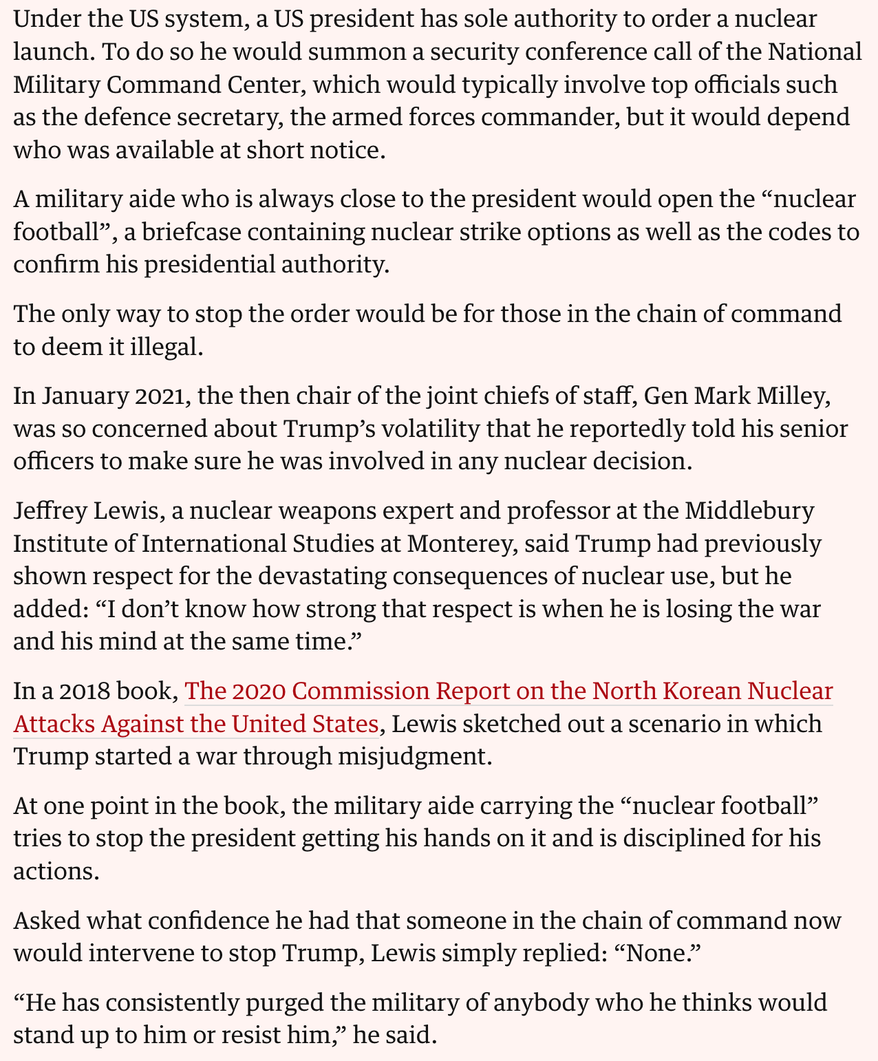 미들베리 국제학연구소의 핵 정책 전문가 제프리 루이스 교수는 트럼프가 과거엔 핵 사용으로 인한 비참한 파장을 깊이 인식하고 있었다고 평가한다.