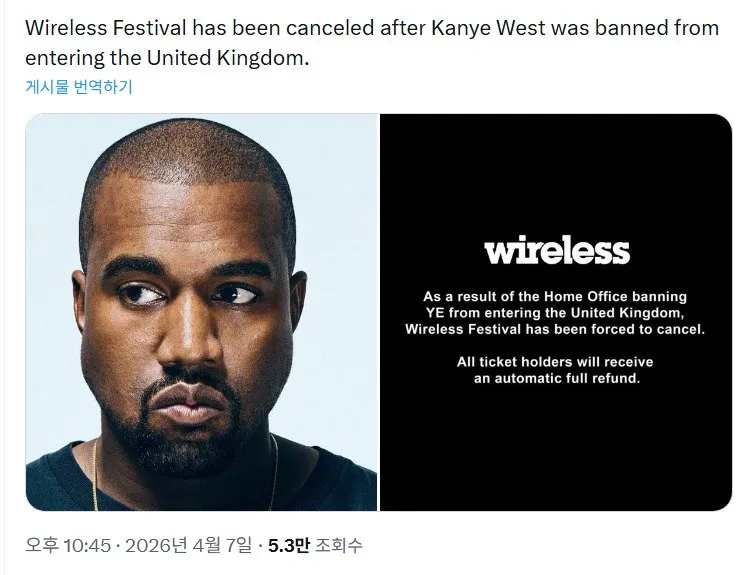 칸예가 영국 못 들어간댄데 공연도 없어졌네