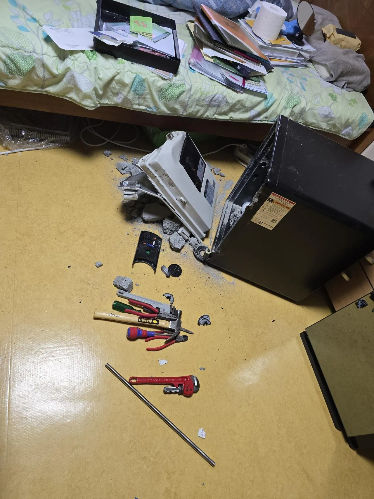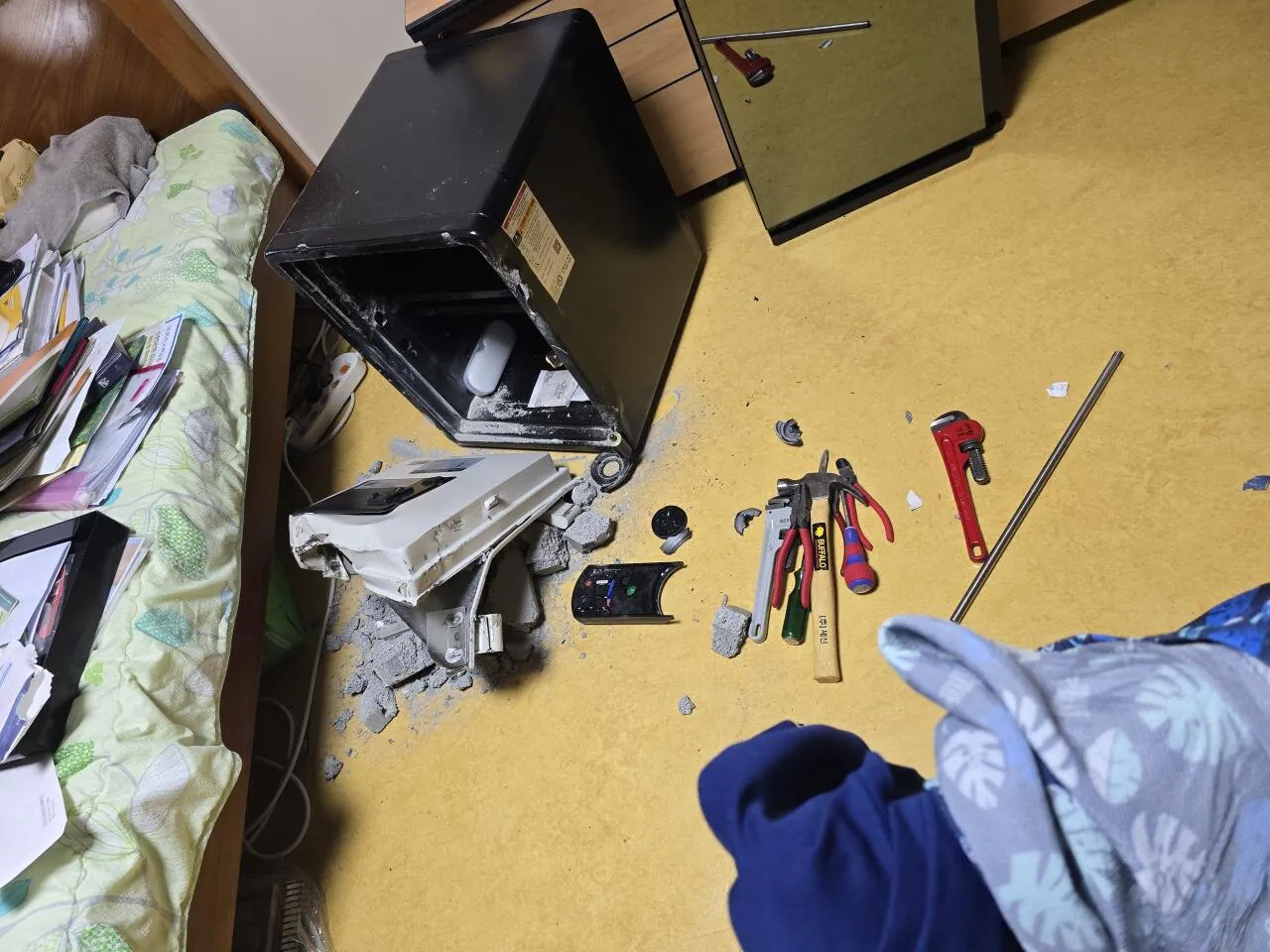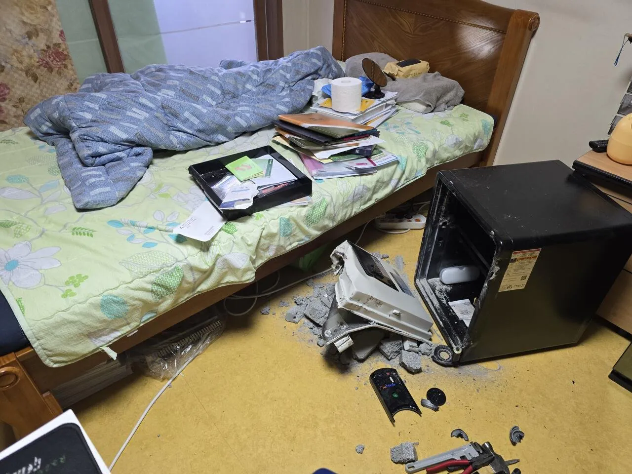 어제 오전에 저희 어머니가 다른 사람과 함께 아버지 금고를 파괴하고 금 15돈과 현금 750만원, 각종 서류를 훔쳐가셨어요. 경찰이 출동해서 엘리베이터 CCTV로 확인해주셨더라고요.
