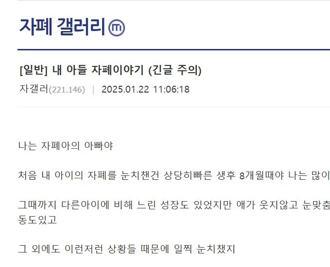아내한테 아이가 자폐일 수도 있다는 생각을 말했어. 아직은 어리니까 대학병원 정신과를 한번 가보자고 했는데 아내는 크게 반발했어. 그럴 리 없다고 계속 말했어.
