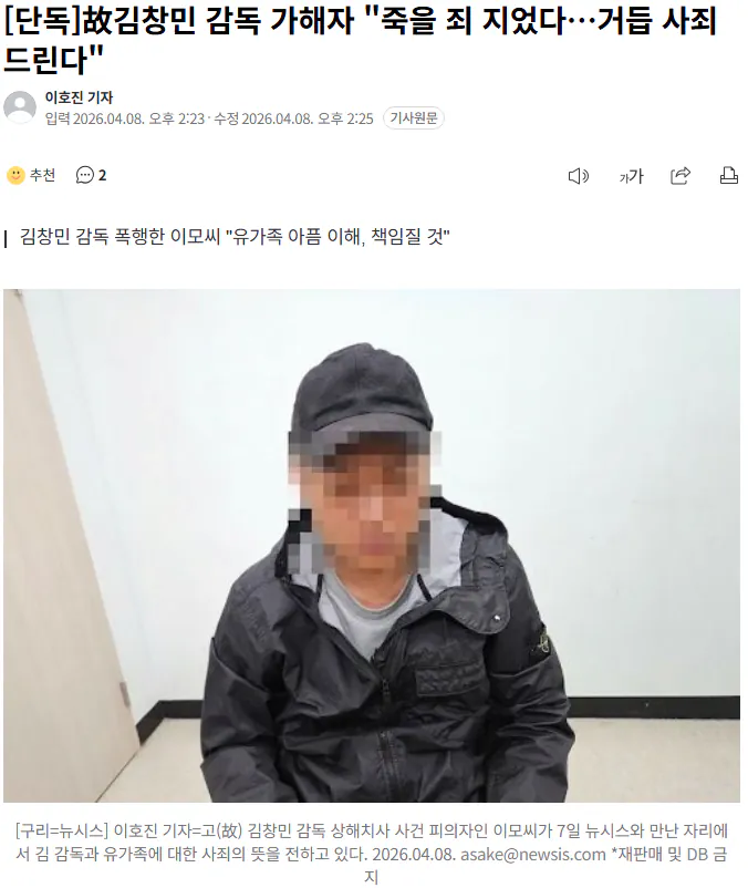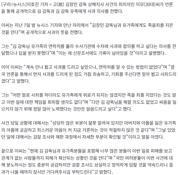 故김창민 감독 사건과 관련해 가해자가 지속적으로 사과의 뜻을 나타내고 있다. 당사자는 "죽음으로도 부족한 죄를 범했다"며 극도의 자책감을 드러내고 있다.
