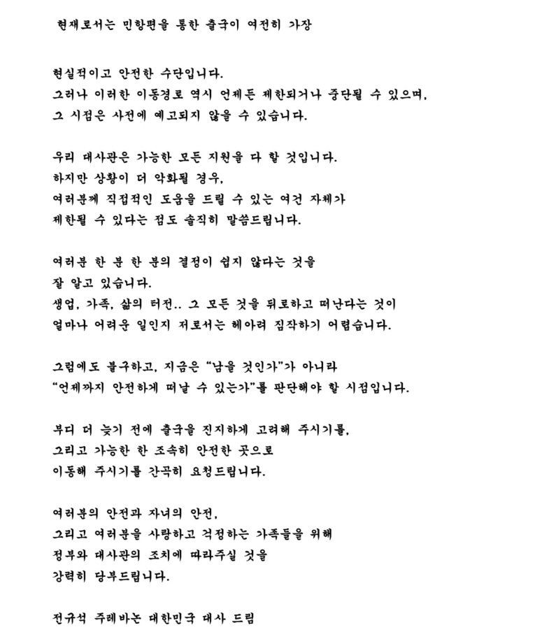 대사관이 '남을까 말까'에서 '안전하게 나갈 수 있는 시간이 얼마나 남았나'로 입장을 완전히 바꿨다는 게 의미심장하다. 상황이 정말 심각해졌다는 신호인 셈이다. 정신이 번쩍 드는 메시지다.