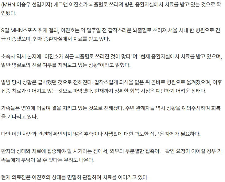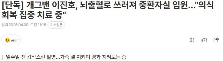 개그맨 이진호가 뇌출혈로 갑자기 쓰러져 병원 중환자실에 입원했다고 한다. 현재 병원에서 의식을 되찾기 위한 집중 치료를 진행 중인 것으로 알려졌다.