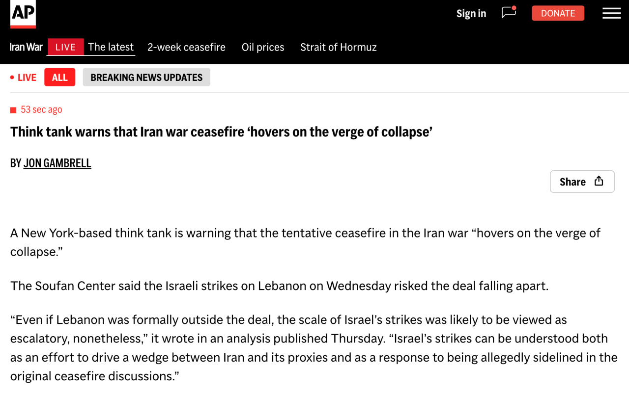 국제 분석 기관이 현재 이란과의 전쟁 휴전이 완전히 무너질 위기 상황이라고 지적했다. 이스라엘의 최근 레바논 공습이 이러한 휴전 협상을 깨뜨리는 직접적인 원인이 될 수 있다는 분석이다. 비록 레바논이 공식적인 합의 국가로는 포함되지 않았지만, 이스라엘의 대규모 공습은 분명한 상황 악화로 여겨질 가능성이 크다고 본다. 전문가들은 이스라엘의 이 같은 공습이 이란 진영 내 갈등을 조장하면서 동시에 휴전 논의에서 자신들이 충분히 대우받지 못한 것에 대한 반격으로 볼 수 있다고 평가했다.