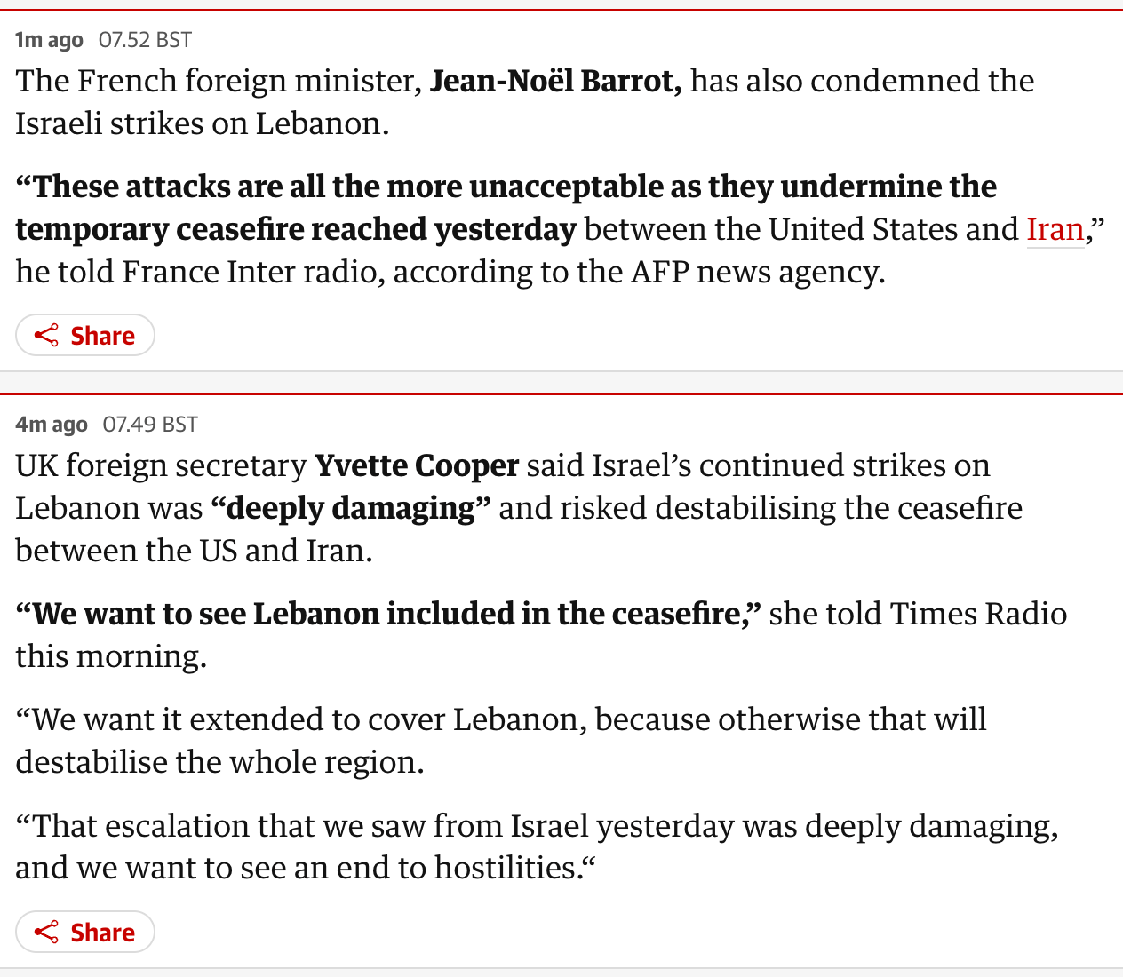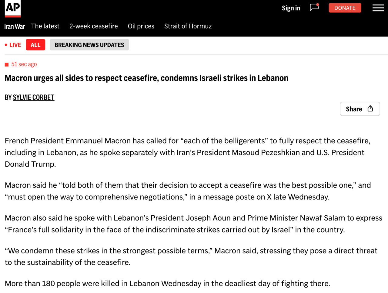 마크롱 프랑스 대통령이 이스라엘의 공습을 강하게 비판했다. 그는 이란의 페제시키안 대통령, 미국의 트럼프 대통령과 각각 통화를 진행해 휴전 준수의 중요성을 강조했다. 수요일 밤 엑스를 통해 공식 입장을 밝힌 마크롱은 '휴전에 동의하는 것이 모든 당사자에게 올바른 선택'이라고 강조했으며, '이 합의가 더욱 광범위한 협상으로 나아가는 계기가 되어야 한다'고 덧붙였다. 마크롱 대통령은 레바논의 조제프 아운 대통령과도 별도로 대화를 나누며 상황 해결을 위한 국제적 노력을 기울이고 있다.