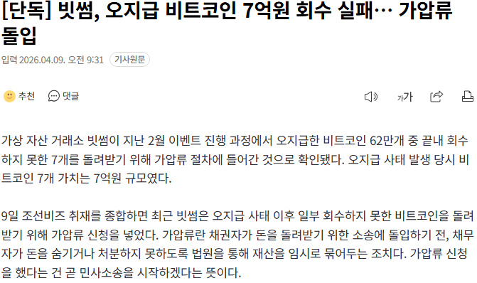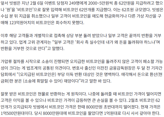 빗썸, 착각해서 보낸 비트코인 7억원 회수 못...
