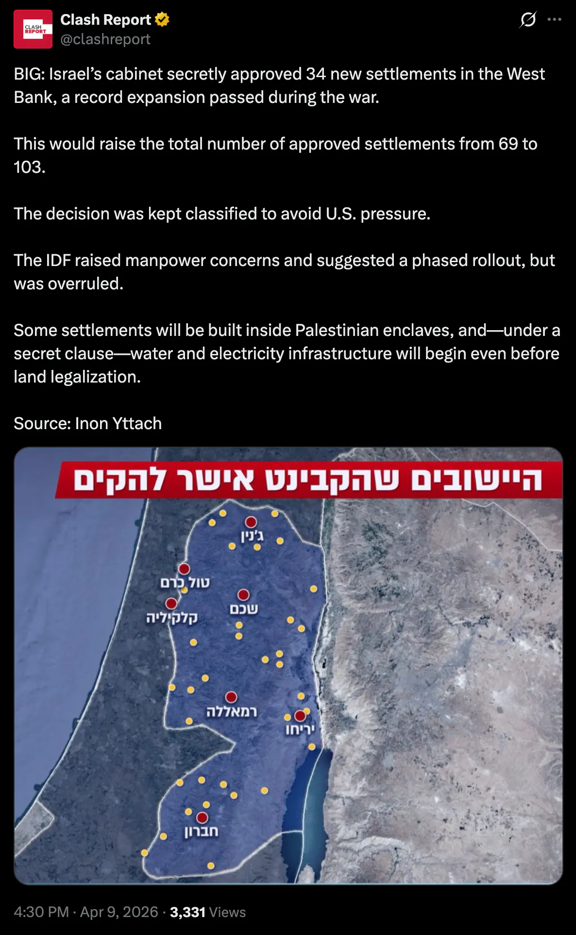 이스라엘 정부가 또 정착촌 확대를 몰래 승인해버렸다. 이번엔 서안지구에 34곳을 새로 지으려는 건데, 기존 69곳과 합치면 총 103곳까지 가게 된다. 이 정도 규모로 한 번에 승인된 건 처음이라고 한다.