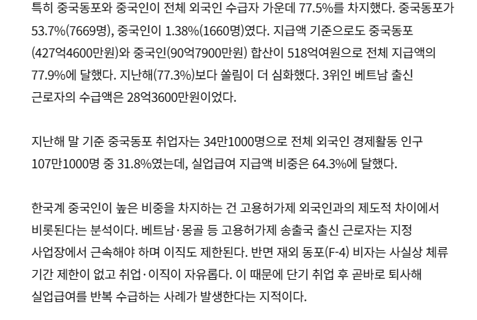 2025년 법무부 자료를 보면 중국(한국계 포함)이 약 35.2%로 가장 큰 비중을 차지하고 있으며, 그 다음으로 베트남 약 12.1%, 미국 약 6.5%, 태국 약 6.1% 순서다. 이는 건강보험 통계로도 확인되는데, 2023년 말 현재 국내 외국인 건강보험 가입자 146만 명 중 약 70만 명이 중국인으로 약 50% 수준이다. 더불어 작년 기준 건보 혜택을 받은 외국인 133만 명 중에서도 중국인이 71만 명을 차지하며 절대다수를 이루고 있는 상황이다.
