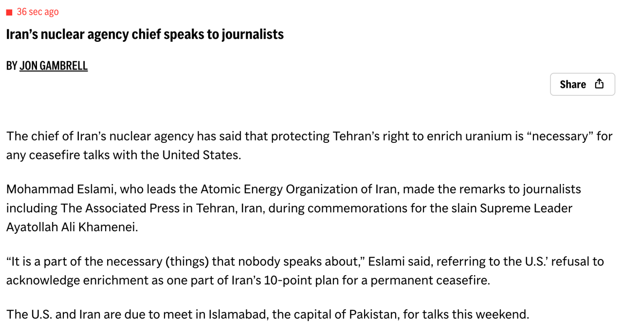 모하마드 에슬라미 의장이 AP 등 언론사 기자들에게 한 말이고, 평화 협정을 위해 제시한 10개 조건 중에서 농축권 인정이 빠져 있다면서 미국을 지적했습니다.