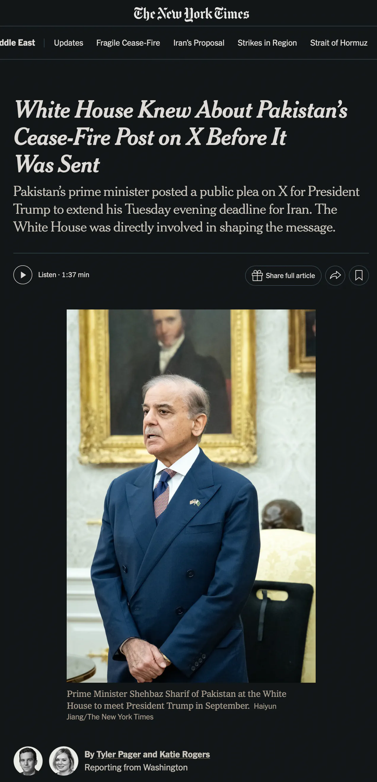 트럼프 대통령의 이란 시한이 다가오자 파키스탄이 움직였다. 양측을 위한 출구전략을 찾으려던 것이다.셰바즈 샤리프 파키스탄 총리는 X에 글을 올렸다. 트럼프의 독특한 말투를 따라하면서 외교가 '꾸준하고 강력하게 진행 중'이라고 호소했다.하지만 이는 모두 각본된 움직임이었다. 이 글의 작성 과정에 백악관이 직접 관여했던 것이다. 국제 중재를 위한 절박한 호소처럼 보였지만, 실제로는 백악관과 파키스탄 측이 미리 조율한 것이었던 셈이다.