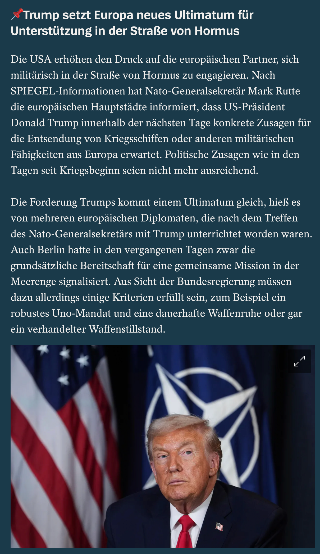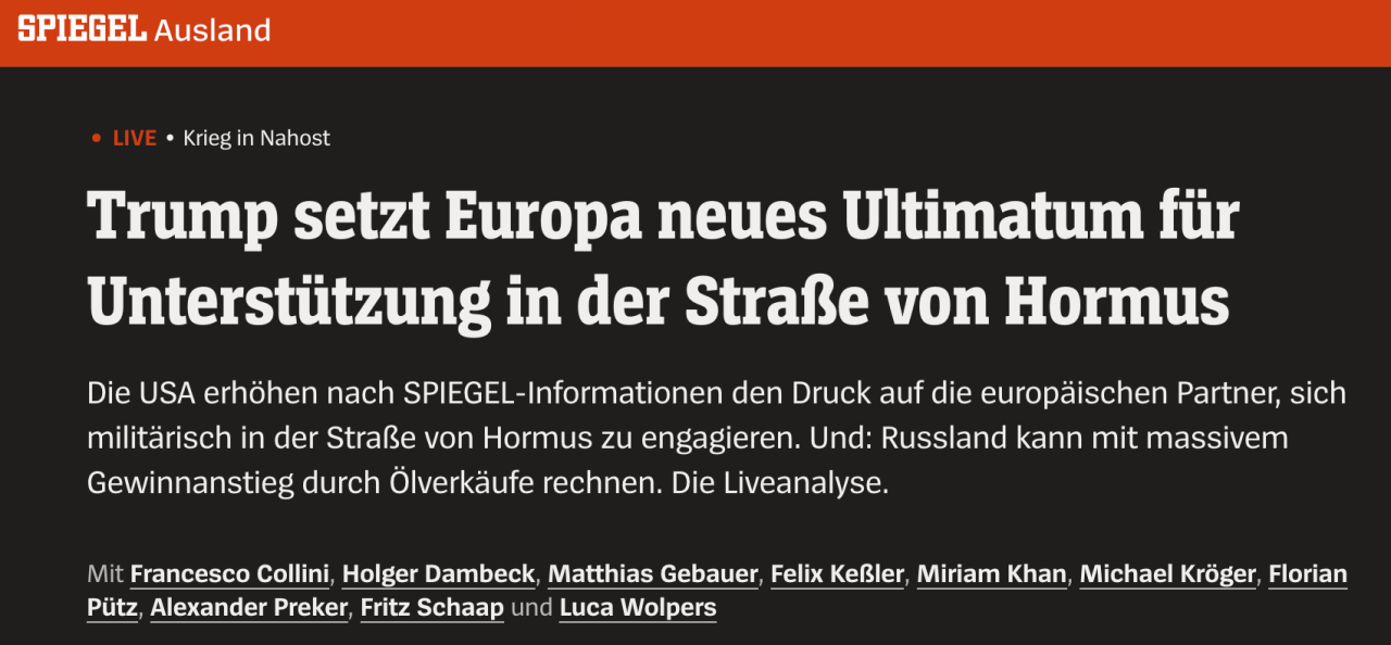 호르무즈 해협의 군사적 안정 문제로 미국이 유럽 동맹국들을 계속 압박하고 있네요. 슈피겔 통신이 입수한 정보로는 트럼프 대통령이 며칠 내에 유럽 국가들로부터 군함 파견이나 군사 장비 지원에 대한 명확한 약속을 받으려 하고 있으며, 이를 나토 사무총장이 유럽 주요국 지도자들에게 전달했다고 합니다. 지난 전쟁 이후 계속된 정치적 성명만으로는 더 이상 부족하다는 게 미국 측의 입장입니다.