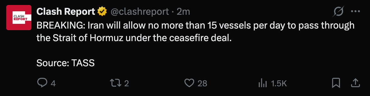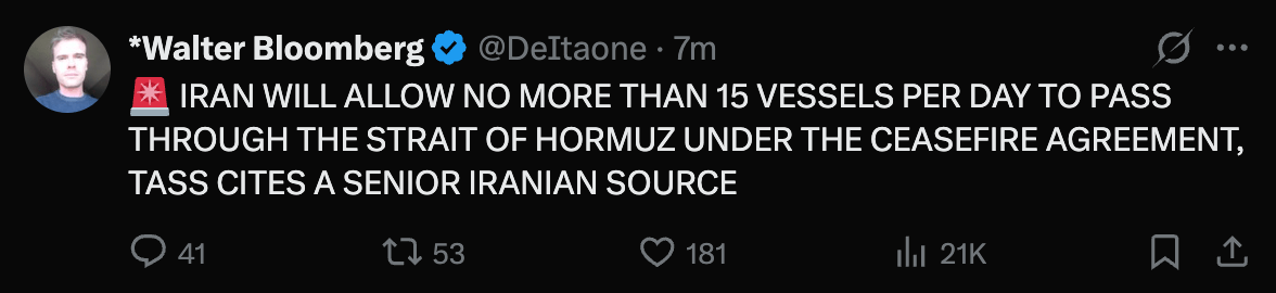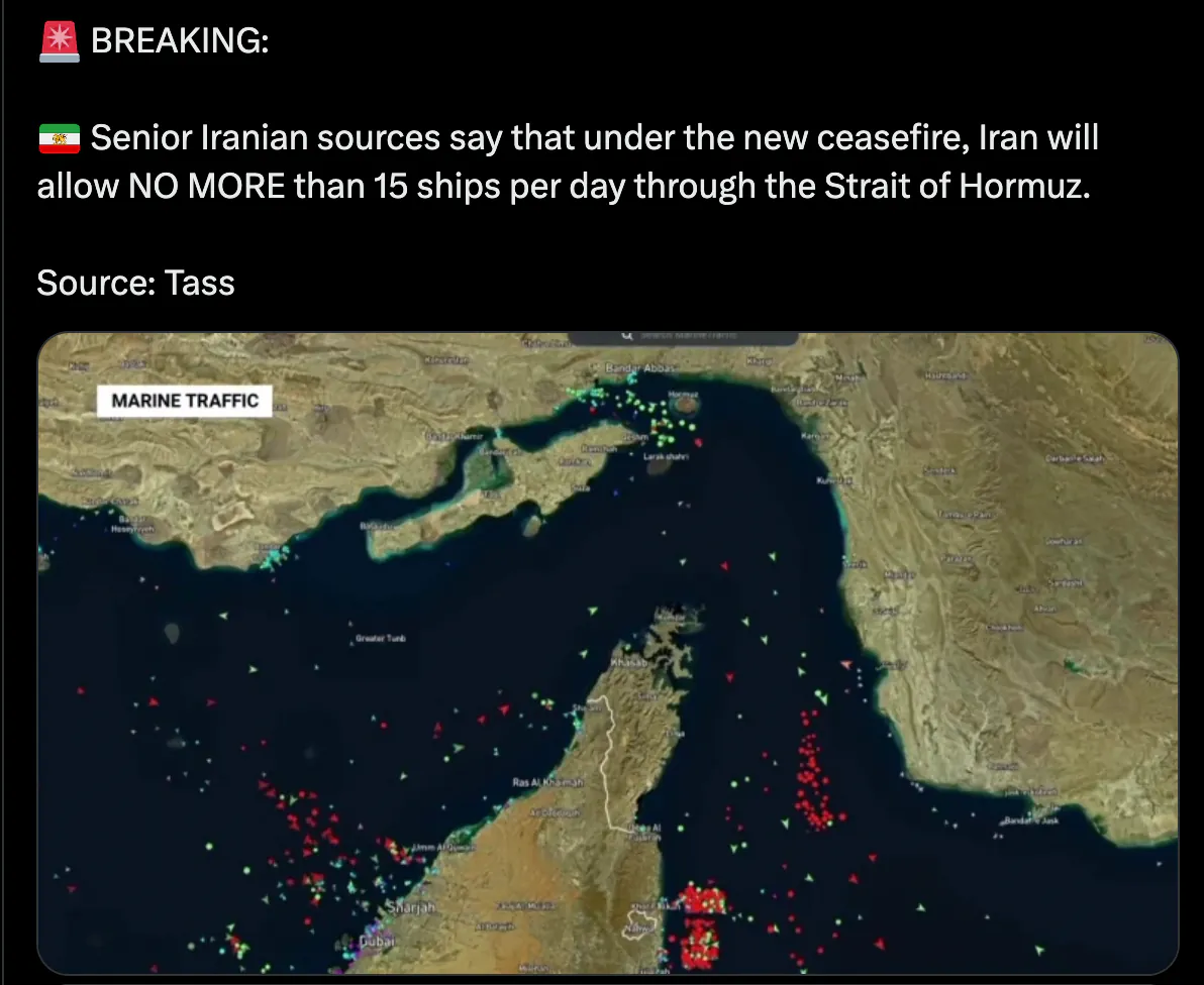 휴전 협정 준수 차원에서 이란 고위관계자는 타스통신과의 인터뷰에서 호르무즈 해협을 통과하는 선박 수를 매일 15척 이하로 제한할 것이라고 밝혔습니다.
