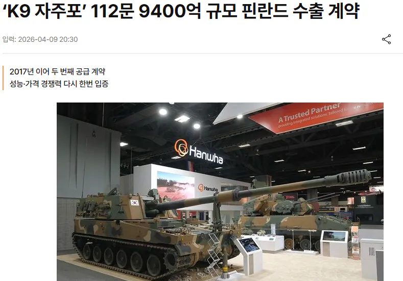 핀란드가 우리 K9 자주포를 또 사기로 했다. 2017년 이후 두 번째 계약이라고. 총 112문짜리 규모인데 계약금이 약 9400억원이니 상당하다. 한화에어로스페이스가 주도했고 방위사업청과 코트라가 협상에 참여했다고 한다. 지난해 8월부터 7개월간 협상이 진행됐다. 북유럽의 방산 강국인 핀란드에서 우리 K9의 성능과 가격 경쟁력을 계속 인정하는 걸 보니 꽤 의미 있네.