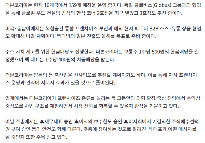지난해 더본코리아 실적을 보니까매출이 3,612억을 기록했대근데 영업손실이 237억 규모래그런데 백종원 대표 지분을 계산해보면보유 주식 879만주가 넘는다고현시점 주가 400원을 곱하면약 35억 1,714만원대가 된다는데그게 배당금으로 나온다는 얘기네