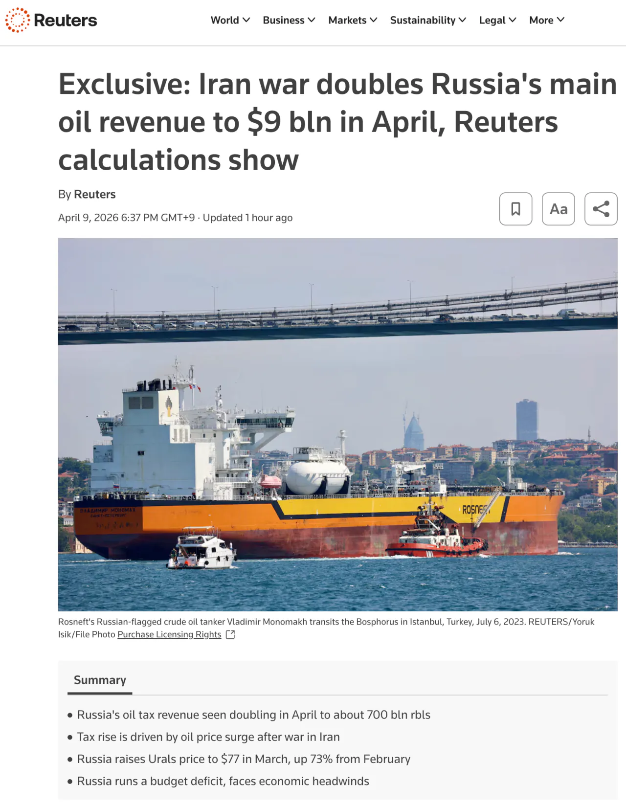 이는 3월과 비교해 정확히 2배 증가한 수치입니다. 3월 우랄산 원유도 2월 대비 73% 폭등하면서 가격 상승세가 가팔랐습니다. 다만 러시아의 전체 경제 상황이 좋은 것만은 아닙니다. 1분기 재정 적자가 상당하고 우크라이나와의 전쟁으로 인한 에너지 시설 손상이 계속되고 있기 때문입니다.