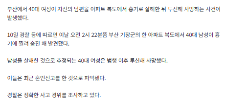 40대 여성이 남편을 해친 뒤 아파트 고층에서 극단적 결말을 선택한 것으로 알려졌다.